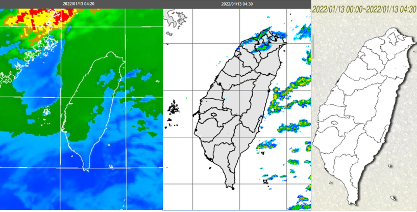 圖:今(13日)晨4:20紅外線色調強化雲圖顯示,中部以北仍有較多的中低雲(左圖)。4:30雷達回波合成圖則顯示,中部以北雲層中含有的水滴少,僅北部有零星的弱回波(中圖)。各地幾無降雨(右圖)。 |
