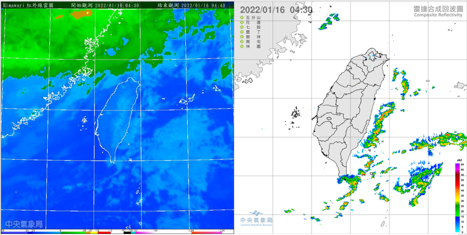 今續回暖溫差大 明日變天轉濕涼吳德榮2022/1/16 《本專欄轉載自「三立準氣象· 老大洩天機」,引用請註明,切勿斷章取義、任意竄改》 今(16日)晨冷空氣已減弱,強「輻射冷卻」作用仍帶來11度左右的本島平地最低氣溫(截至4:53:新竹關西鎮11.1度,雲林虎尾鎮、南投中寮鄉11.2度)。其他各地區的平地最低氣溫如下:北部(基隆七堵區)11.8度,南部(台南下營區)11.6度,東部(花蓮壽豐鄉)13.2度。(再降請自行更新) 4:30紅外線色調強化雲圖顯示,各地晴朗,東側海上有低雲(左圖);4:30雷達回波合成圖顯示,東側海上有回波(右圖);各地無降雨。