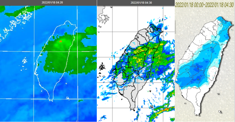 圖:今(18日)晨4:20紅外線色調強化雲圖顯示,各地雲量多(左圖);4:30雷達回波合成圖顯示,台中至高雄有回波通過(中圖);高雄以北及東半部有局部降雨(右圖)。 |