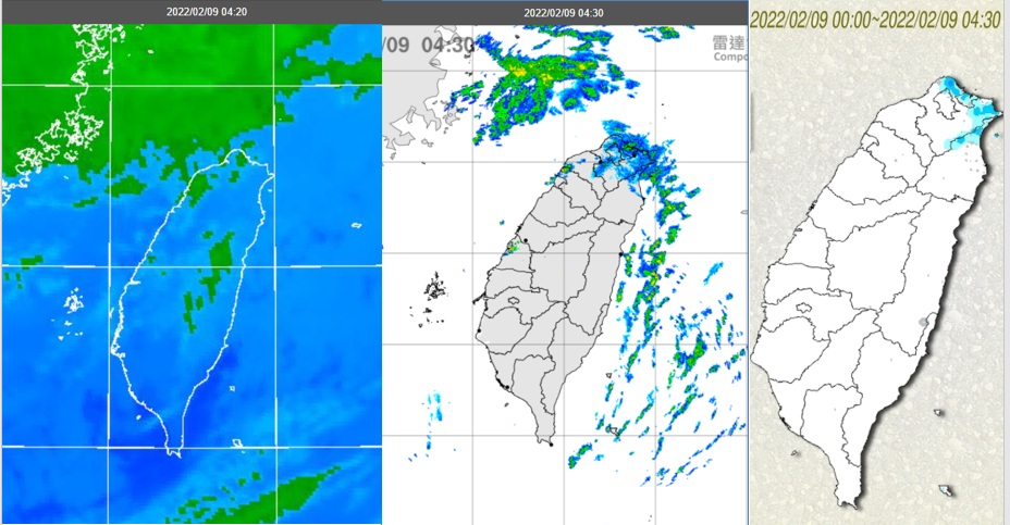 左圖:9日4:20紅外線雲圖顯示,迎風面有較多的低層雲,華南有鬆散的中層雲移出。 中圖:4:30雷達回波合成圖顯示,迎風面及台灣海峽北部有弱回波,台灣東側海面亦有一些。 右圖:4:30累積雨量圖顯示,北海岸、東北部有零星降雨。 |