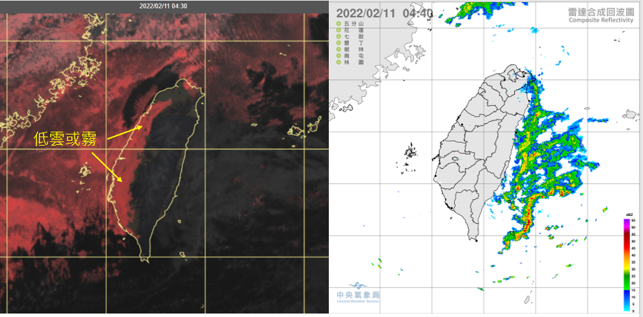 圖:11日4:30真實色雲圖顯示,西半部已有局部霧出現(左圖)。4:40降水回波合成圖顯示,降水回波在台灣東側海面(右圖)。 |