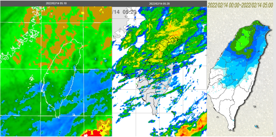 圖:14日5:10紅外線雲圖顯示,「鋒面」雲系籠罩(左圖)。5:20降水回波合成圖顯示,中部以北降水回波明顯(中圖)。5時累積雨量圖顯示,中部以北明顯降雨,台南亦有零星降雨(右圖)。 |