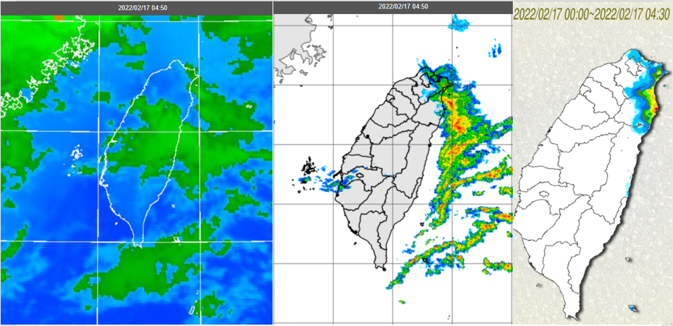 圖:17日4:50紅外線雲圖顯示,迎風面可見較多的中低雲,華南移出的中層雲亦增多(左圖)。4:50雷達回波合成圖顯示,東方海面的回波較強,部分觸及東北部(中圖)。4:30累積雨量圖顯示,宜蘭有較大降雨(右圖)。 |