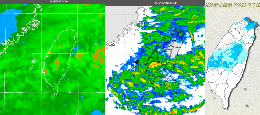 圖:18日4:50紅外線雲圖顯示,鋒前雲系持續移入,中層雲漸增厚(左圖)。4:50雷達回波合成圖顯示,海峽不斷有回波通過台灣(中圖)。5時累積雨量圖顯示,大台北及中部降雨較明顯,其他各地皆有間歇飄雨的現象(右圖)。 |