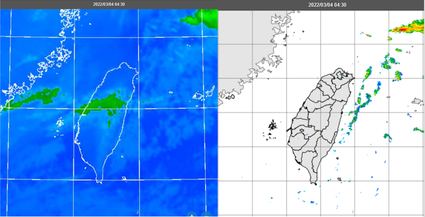 今微熱週末微降 下週一春寒料峭吳德榮2022/3/4 《本專欄轉載自「三立準氣象· 老大洩天機」,引用請註明,切勿斷章取義、任意竄改》 觀測資料顯示,今(4日)晨中部上空有結構鬆散的中層雲(左圖),東側海上有微弱線狀降水回波(右圖),各地無降雨,竹、苗有晨霧。今晨截至4:53,本島平地最低氣溫為新竹關西鎮14.6度;各地區最低氣溫:北部(新北新店區)15.4度,中部(台中大甲區)16.1度,南部(台南後壁區)16.1度,東部(花蓮壽豐鄉)15.3度。(再降、請自行更新)