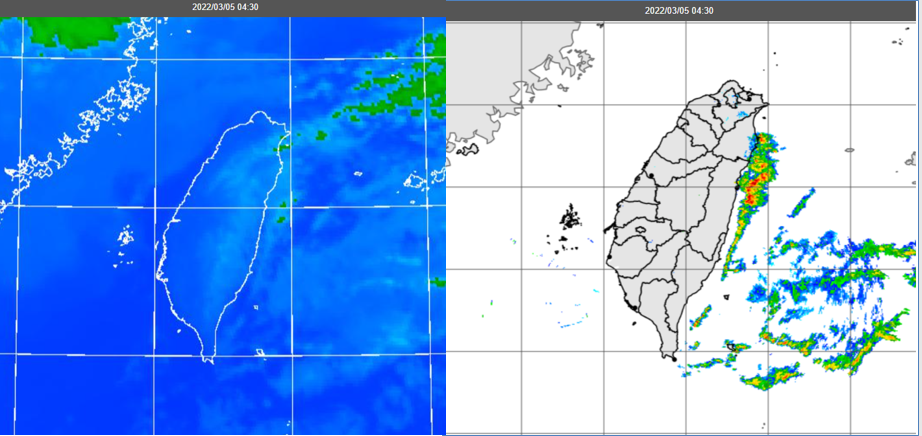 圖:5日4:30紅外線色調強化雲圖顯示,東側海上有較多的低層雲(左圖)。4:30雷達回波合成圖顯示,東側海上有線狀降水回波(右圖)。 |