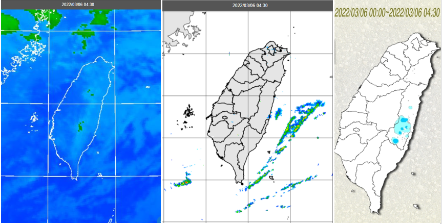 圖:6日4:30紅外線色調強化雲圖顯示,迎風面有較多的低層雲(左圖)。4:30雷達回波合成圖顯示,,東側海上有降水回波(中圖)。花蓮有局部少量降雨(右圖)。 |