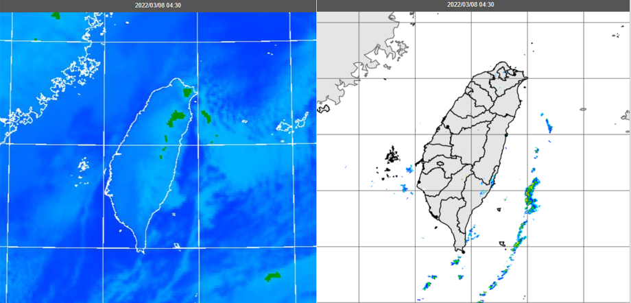 今起晴朗至週日 日夜溫差應注意吳德榮2022/3/8 《本專欄轉載自「三立準氣象· 老大洩天機」,引用請註明,切勿斷章取義、任意竄改》 觀測資料顯示,今(8日)晨鋒面雲系已遠離,台灣上空雲層稀疏(左圖),陸上已無降水回波(右圖)。強冷空氣及「輻射冷卻」作用,截至5:03本島平地最低氣溫依序為:雲林古坑鄉8.1度,嘉義東區8.4度,台中大甲區8.7度;其他各地區低溫:北部(新北淡水區)9.8度,南部(台南白河區、高雄大樹區)9.3度,東部(花蓮壽豐鄉)11.0度;台北(大安區)10.3度。因台北測站低溫已降至11.9度,這波冷空氣已符合「強烈大陸冷氣團」標準。(再降、請注意更新)