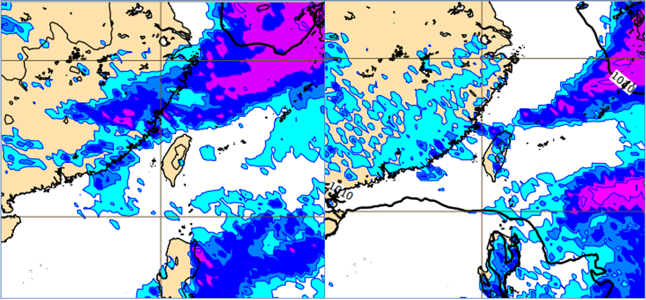 圖:最新(8日20時)歐洲(ECMWF)模式模擬14日8時(左圖)及20時地面圖(右圖)顯示,「鋒面」在減弱的過程中、快速掠過,為北台灣及東半部帶來局部短暫降雨的機率。 |