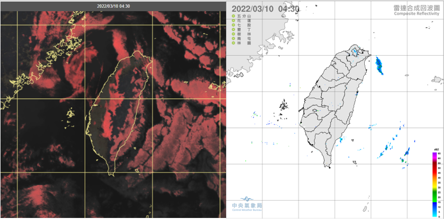 圖:10日4:30真實色雲圖顯示,台灣上空有零散的低雲(左圖)。4:30雷達回波合成圖顯示,降水回波不明顯(右圖)。 |