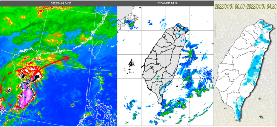 圖:今(1日)4:20紅外線雲圖顯示,迎風面有較多的低層雲,新竹以北有中層雲移入;中南半島有熱帶雲系消長(左圖)。4:30雷達回波合成圖顯示,迎風面及東側海面有降水回波(中圖),4:30累積雨量圖顯示,新竹以北及東半部有降雨,北海岸、東半部較明顯(右圖)。 |