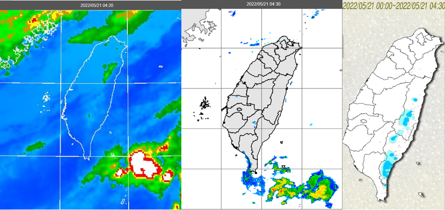 圖:今(21日)晨4:20紅外線色調強化雲圖顯示,對流雲在台灣東南方海面,台灣上空雲層稀疏(左圖);4:30雷達回波合成圖顯示,台灣上空無降水回波(中圖);4:30累積雨量圖顯示,東半部有局部降雨(右圖)。 |