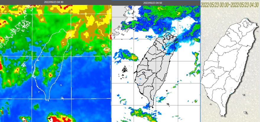 圖:今(23日)晨4:30紅外線色調強化雲圖顯示,北部有零散的雲層(左圖);4:50時雷達回波合成圖顯示,降水回波微弱(中圖);4:30累積雨量圖顯示,北海岸、東半部有局部零星飄雨(右圖)。 |