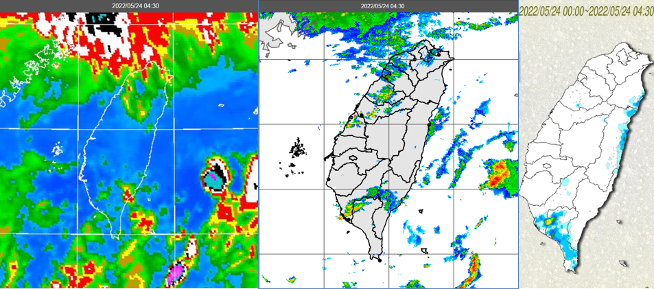 圖:今(24日)晨4:30紅外線色調強化雲圖顯示,台灣上空雲層鬆散(左圖);4:30時雷達回波合成圖顯示,局部地區有降水回波(中圖);4:30累積雨量圖顯示,各地區皆有局部降雨(右圖)。 |