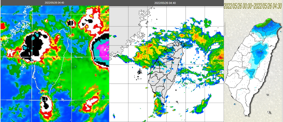 圖:今(26日)晨4:40紅外線色調強化雲圖顯示,強對流雲分布在台灣海峽南、北(左圖);4:40雷達回波合成圖顯示,伴隨較強降水回波(中圖);4:30累積雨量圖顯示,北部地區及中南部山區已有明顯降雨(右圖)。 |