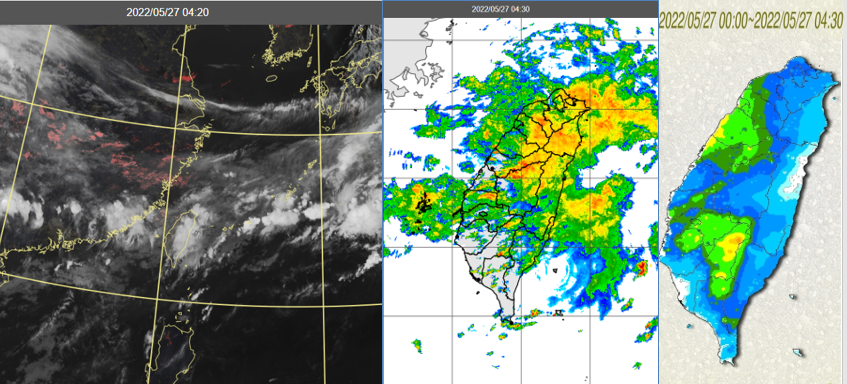 圖:今(27日)晨4:20真實色雲圖顯示,「滯留鋒」雲帶通過台灣上空,強對流雲在其中發展(左圖);4:30雷達回波合成圖顯示,伴隨較強降水回波(中圖);4:30累積雨量圖顯示,各地有降雨,以苗栗、台中沿海及南部山區雨量最多(右圖)。 |
