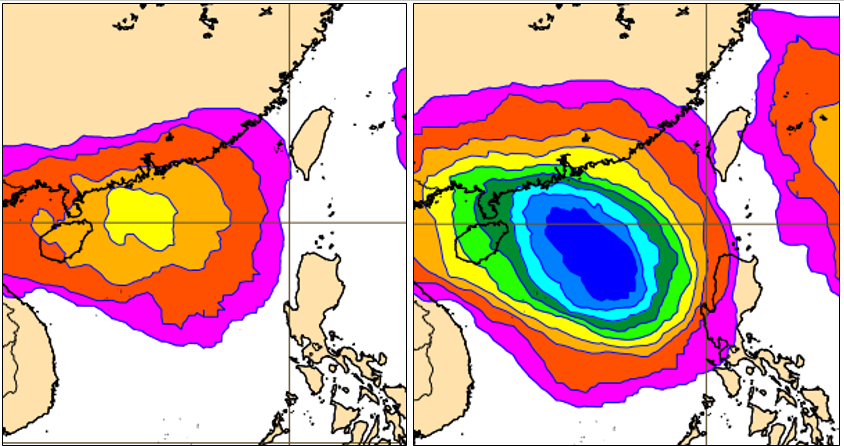 圖:最新(26日20時)歐洲(ECMWF)系集模式,模擬2日20時南海有「熱帶擾動」發展,其機率達90%(右圖),發展成颱的機率亦同時調高至40%(左圖)。 |