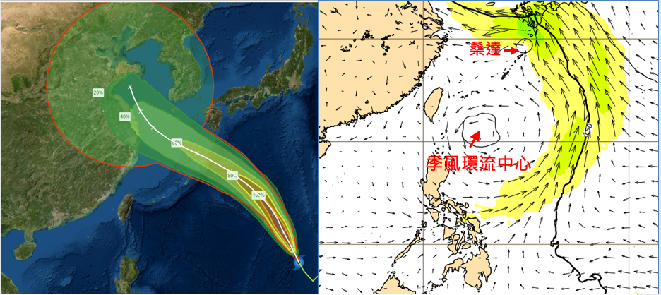 左圖:28日2時中央氣象局「路徑潛勢預測及侵襲機率圖」顯示,「熱帶性低氣壓」將發展為輕颱「桑達」,未來經琉球北方至東海後有減速轉向的趨勢,無侵襲台灣的機率。 右圖:27日20時歐洲(ECMWF)模式,模擬29日20時850百帕等高線及風場圖顯示,「季風環流」中心在台灣東方海面,「桑達」已繞至「季風環流」的北側。 |