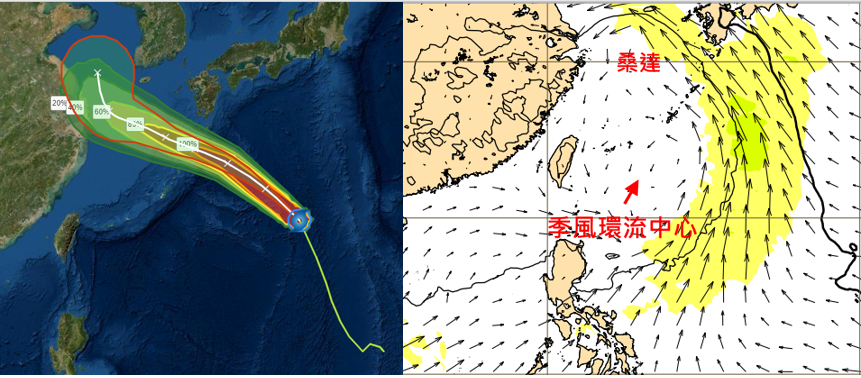 左圖:29日2時中央氣象局「路徑潛勢預測及侵襲機率圖」顯示,「桑達」強度偏弱,未來順著「季風環流」邊緣的「導引氣流」前進,經琉球北方至東海,之後有減速、北轉的趨勢,無侵台的機率。 右圖:28日20時歐洲(ECMWF)模式,模擬29日20時850百帕等高線及風場圖顯示,「季風環流」的中心及西側結構較鬆散,東側的「西南季風」則較強。 |