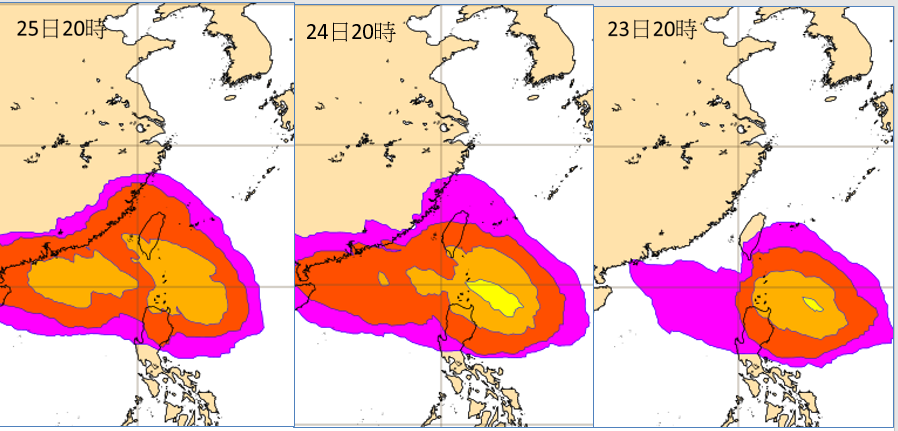 圖:最新(16日20時)歐洲(ECMWF)系集模式,由右至左為第7至第9天(23日至25日)的模擬圖顯示,在台灣東南方有「熱帶擾動」活動,往巴士海峽靠近,不確定性範圍大。 |