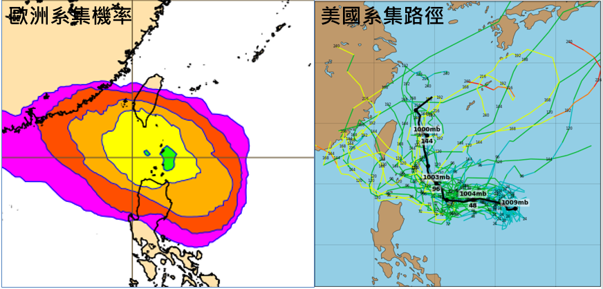 最新(19日20時)歐洲(ECMWF)系集模式模擬顯示,明(21)日台灣東南方有「熱帶擾動」活動的機率,大致往西北移動;下週三(24日)接近巴士海峽時(左圖),成颱的機率雖低於50%,但不能排除。美國(GEFS)系集模式模擬的路徑包括從台灣東方遠海北上至西進擦過呂宋島都有(右圖),21條模擬路徑中有5條通過台灣或鄰近海域,顯示直接影響機率雖不高,但也不宜完全排除;故是否成颱、是否會進入台灣的警戒範圍?都還不確定,且模式會再調整,應持續觀察。
