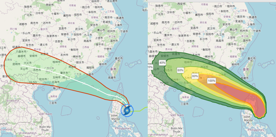 圖:23日2時中央氣象局「路徑潛勢預測圖」(左圖)顯示,第9號輕颱「馬鞍」在呂宋島東方,未來擦過呂宋島東北端、再朝西北西、經東沙島附近、撲向廣東。「暴風圈侵襲機率圖」(右圖)則顯示,「輕颱馬鞍」的暴風圈進入台灣鄰近100公里海域的機率約20%。 |