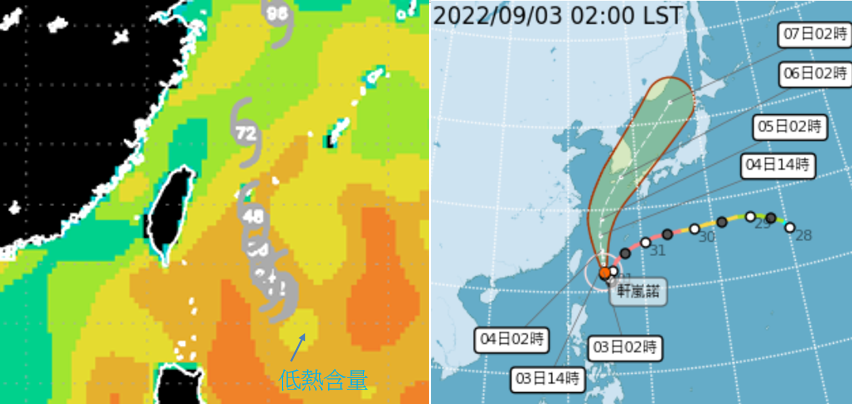 今至明上午風雨最強 慎防土石流吳德榮2022/9/3 《本專欄轉載自「三立準氣象· 老大洩天機」,引用請註明,切勿斷章取義、任意竄改》 中颱「軒嵐諾」雖因台灣阻斷部分水氣,但由於颱風向北移動,已脫離被攪翻的冷海水,未來途經的海洋熱含量(OHC)仍有利颱風緩慢增強(左圖)。最新(3日2時)中央氣象局「路徑潛勢預圖」(右圖)顯示,「軒嵐諾」偏北而行,經宮古、石垣島附近北上,暴風圈邊緣將掠過東北角,經東海轉東北,通過南韓及對馬海峽一帶。
