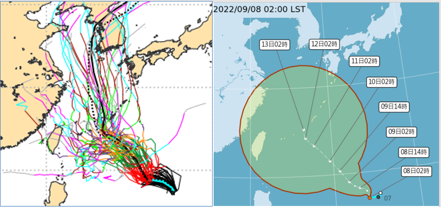 左圖:最新(7日20時)歐洲(ECMWF)系集模式顯示,50次的模擬路徑,大致朝西北前進、再轉北,但相當分歧。 右圖:8日2時中央氣象局的「路徑潛勢預測圖」顯示,今日將發展成第12號颱風「梅花」;向西北往琉球附近、再轉北,70%中心移入的機率範圍(紅框)很大。 |