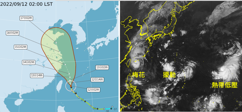 梅花東側北上 颱風發展活躍期已到吳德榮2022/9/12 《本專欄轉載自「三立準氣象· 老大洩天機」,引用請註明,切勿斷章取義、任意竄改》 最新(12日2時)中央氣象局的「路徑潛勢預測圖」(左圖),今、明(12、13日)由於導引氣流偏弱,「梅花」在石垣島附近,緩慢北上;14日逐漸加速、轉向北北西。潛勢預測的「機率範圍」(紅框)已略縮小,顯示「不確定性」減小。以目前「梅花」的預報資料而言,暴風圈觸及陸地的機率降低,但仍應持續觀察。今晨4:30紅外線雲圖(右圖)顯示,熱帶性低壓在日本東南方遠海,今將發展成第13號颱風「莫柏」,向東北轉北進行,非常遙遠,對台無影響。兩者之間有另一熱帶擾動,亦有發展成颱風的趨勢。顯示目前「西北太平洋」正處於颱風發展的活躍期。