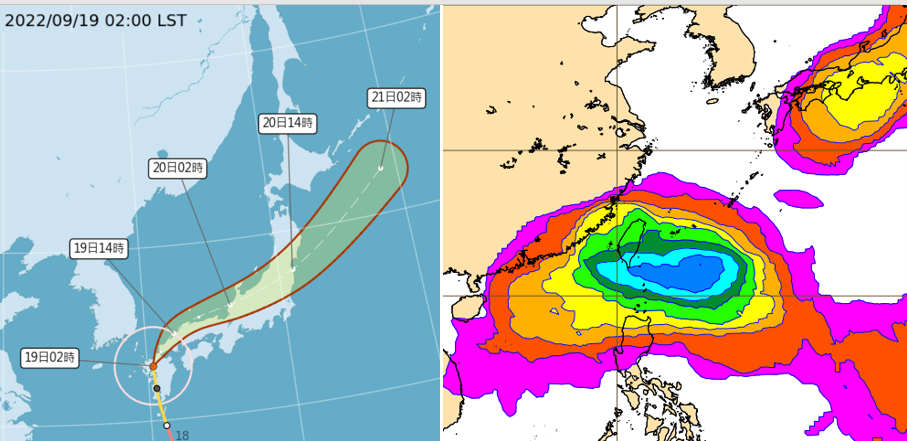 本週盛行東北風 觀察週末熱帶擾動吳德榮2022/9/19 《本專欄轉載自「三立準氣象· 老大洩天機」,引用請註明,切勿斷章取義、任意竄改》 最新(19日2時)中央氣象局的「路徑潛勢預測圖」(左圖)顯示,今(19日)晨「南瑪都」已快速減弱至「中颱」下限,在日本九州西側登陸,轉向東北大迴轉,暴風圈將掃過九州、四國及本州大半,持續減弱中;明(20)日下午進入日本東部海面「變性」、消失。最新(18日20時)歐洲模式(ECMWF)系集模擬顯示,週末前後台灣及巴士海峽附近有「熱帶擾動」活動及發展的機率(右圖),位置超敏感,但有「不確定性」,應持續觀察。