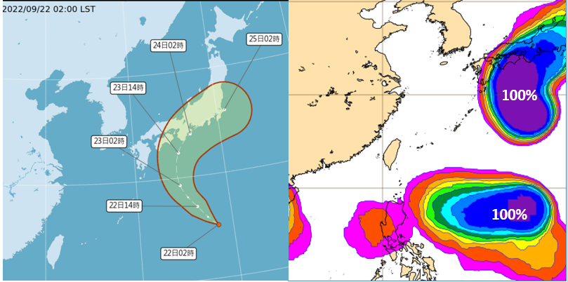 今明乾 週末變天 熱帶擾動發展中吳德榮2022/9/22 《本專欄轉載自「三立準氣象· 老大洩天機」,引用請註明,切勿斷章取義、任意竄改》 最新(22日2時)中央氣象局「路徑潛勢預測圖」(左圖)顯示,日本南方海面的「熱帶低壓」將發展成「輕颱塔拉斯」,掠過日本本州南部。最新(21日20時)歐洲模式(ECMWF)系集模擬顯示,24日20時日本南方及呂宋島東方海面及皆有「熱帶擾動」活動的跡象(右圖);日本南方高達100%,為即將發展的「塔拉斯」,呂宋島東方海面另一高值亦達100% ,但其成颱的機率僅10%。模擬顯示,不論「熱帶擾動」或「颱風」的機率值,在台灣皆為零。不過,在「季風環流」內發展的小型熱帶系統,模式模擬變動性很大,應持續觀察。