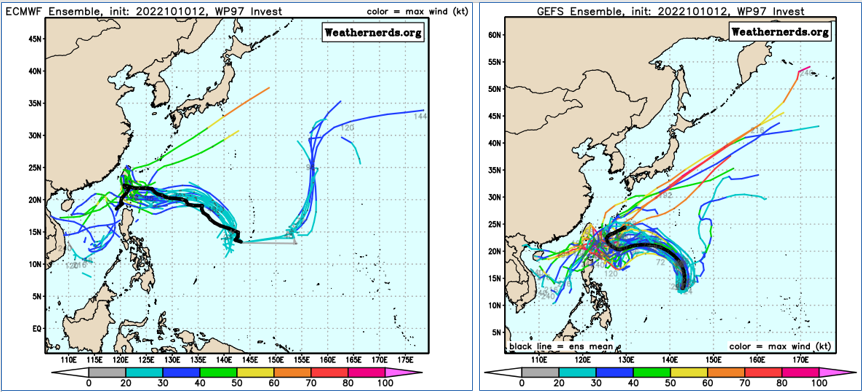 左圖:最新(10日20時)歐洲模式(ECMWF)系集模擬顯示,颱風進入巴士海峽後,呈現北轉或進入南海的分歧。 右圖:最新(10日20時)美國模式(GEFS)系集模擬顯示,部分路徑在台灣東側迴轉,部分路徑則進入巴士海峽,之後亦呈現北轉或進入南海的分歧。(圖擷自weathernerds) |