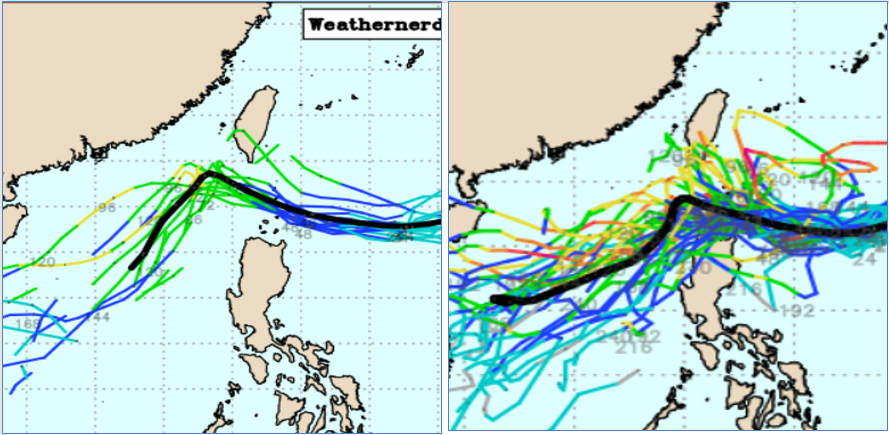 圖:最新(13日20時)歐(左圖)、美(右圖)模式系集模擬顯示,其模擬路徑大多通過巴士海峽,之後略微北偏、再轉西南進入南海。模式模擬路徑仍存在略偏北接近台灣或略偏南接近呂宋島的「不確定性」,應密切觀察。(圖擷自weathernerds) |