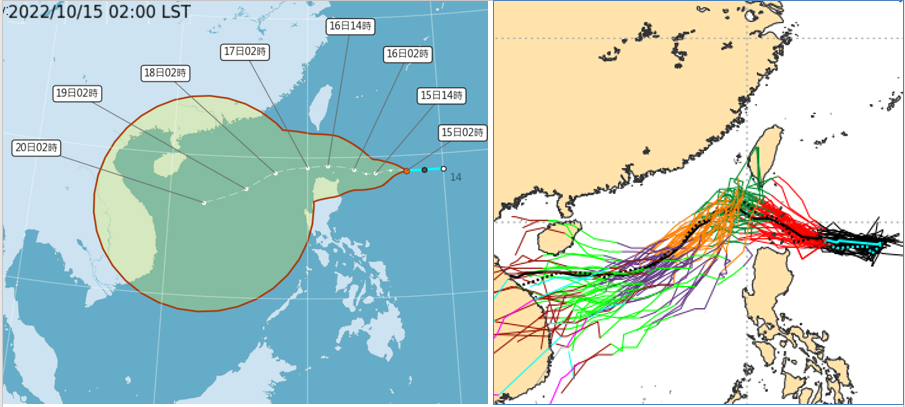 圖:中央氣象局(15日2時)「路徑潛勢預測圖」(左圖)與最新(14日20時)歐洲模式(ECMWF)系集模擬(右圖)類似,大致通過巴士海峽,之後略微北偏、再轉西南進入南海。路徑皆存在略偏北接近台灣或略偏南接近呂宋島的「不確定性」。 |