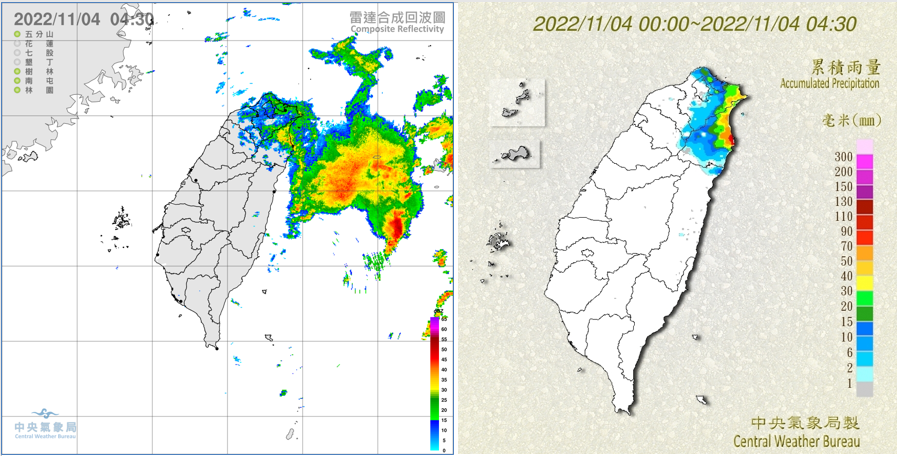 圖:今晨4:30雷達回波合成圖顯示,迎風面回波消長,東北部海面有較強回波(左圖)。4:30累積雨量圖顯示,東北部、大台北有雨,桃園及花蓮地區零星飄雨(右圖)。