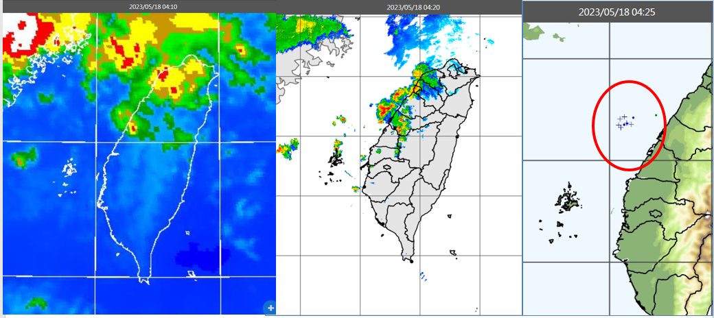 左圖:18日4:10紅外線色調強化雲圖顯示,台灣海峽有小範圍對流雲消長。 中圖:4:20雷達回波合成圖顯示,其伴隨的降水回波快速移入。 右圖:4:25閃電偵測圖顯示,對流雲有閃電現象。 |