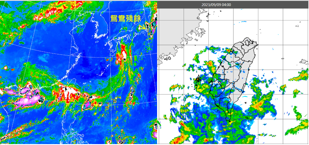 左圖:9日4時紅外線色調強化雲圖顯示,「季風低壓環流」的雲系,籠罩中南部;及未達日本前已減弱消散的「鴛鴦」颱風殘餘雲層。 右圖:4時雷達回波合成圖顯示,南部有昨日午後對流殘餘的回波。 |