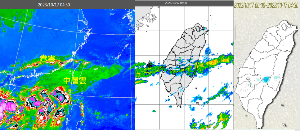 圖:17日4:30晨外線雲圖顯示,源自南海對流雲系的中層雲,通過台灣上空(左圖)。4:30雷達回波合成圖顯示,降水回波很弱,通過中南部(中圖)。4:30累積雨量圖顯示,中南部有局部零星降雨(右圖)。 |
