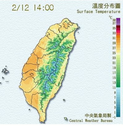 圖:年初五下午2時溫度圖可以觀察到大部分的平地皆已回暖,甚至達27度至29度。 |