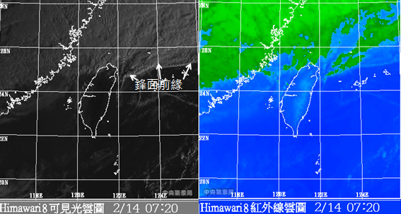 圖:2月14日07:20可見光雲圖顯示鋒面位置在箭頭所指位置,同時紅外線衛星圖也顯示出鋒面雲系結構鬆散。不過隨著東北風的增強,迎風面的雲將逐漸增厚,帶來降雨,氣溫也將明顯下降。