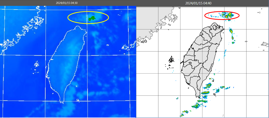 圖:今(15日)晨4:30紅外線色調強化雲圖顯示,各地晴朗無雲,北部海面黃框內為東北風前緣雲層(左圖)。4:40雷達回波合成圖顯示,陸地無降水回波,紅框內為東北風前緣回波(右圖)。 |
