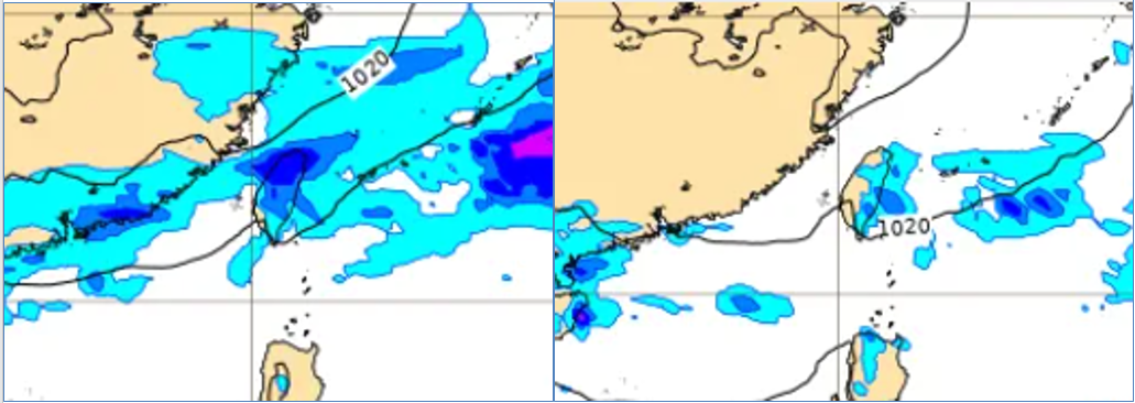 最新模式10天的模擬顯示,下週三(7日)鋒面逐漸南下,下週四(8日)降雨範圍逐步擴大至中部,南部山區亦有局部短暫雨的機率(左圖),除夕(9日)降雨稍減少(右圖);下週三起冷空氣亦逐漸南下,濕冷的天氣持續至除夕;以達「大陸冷氣團」的機率為最高,北部沿海及部分平地除夕將降至11度左右。至於各國模式模擬年初一、二(10、11日)的天氣,差異大、且持續調整,應繼續觀察。