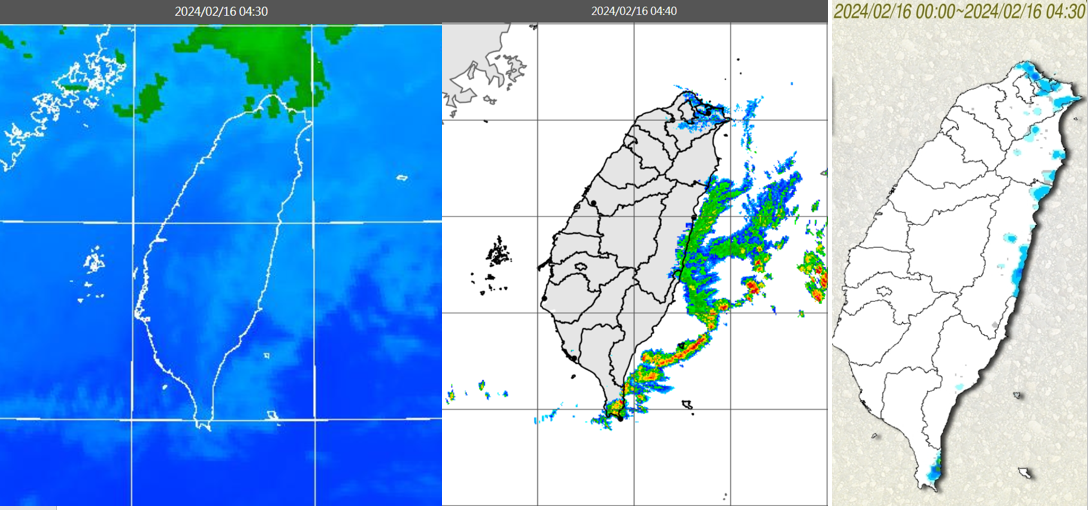 左圖:16日4:30紅外線色調強化雲圖顯示,迎風面低雲增多。 中圖:4:40雷達回波合成圖顯示,北海岸、東半部有零星回波。 右圖:4:30累積雨量圖顯示,北海岸及東半部有零星降雨。