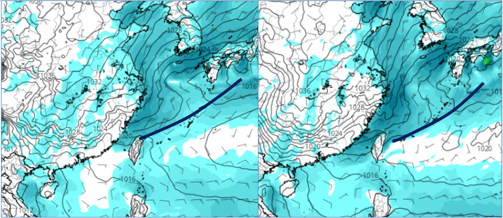 最新模式模擬顯示,週四傍晚「微弱鋒面」掠過(圖)、「東北季風」逐漸南下,迎風面雲量增,北部及東半部轉有局部短暫雨的機率。週五(23日)至下週二(27日)持續受「東北季風」影響,為迎風面易降雨、北台濕涼的天氣型態;由於已近模擬後期,「東北季風」所挾帶的冷空氣如何變化?何時何地氣溫降至最低?又能降至幾度?各國模式皆有誤差、且不斷調整,應持續觀察,言之過早,也是枉然!