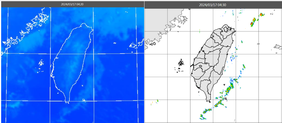 圖:今(17日)晨4:20紅外線色調強化雲圖顯示,中層雲漸消散(左圖)。4:30雷達回波合成圖亦顯示,台灣上空無降水回波(右圖)。 |