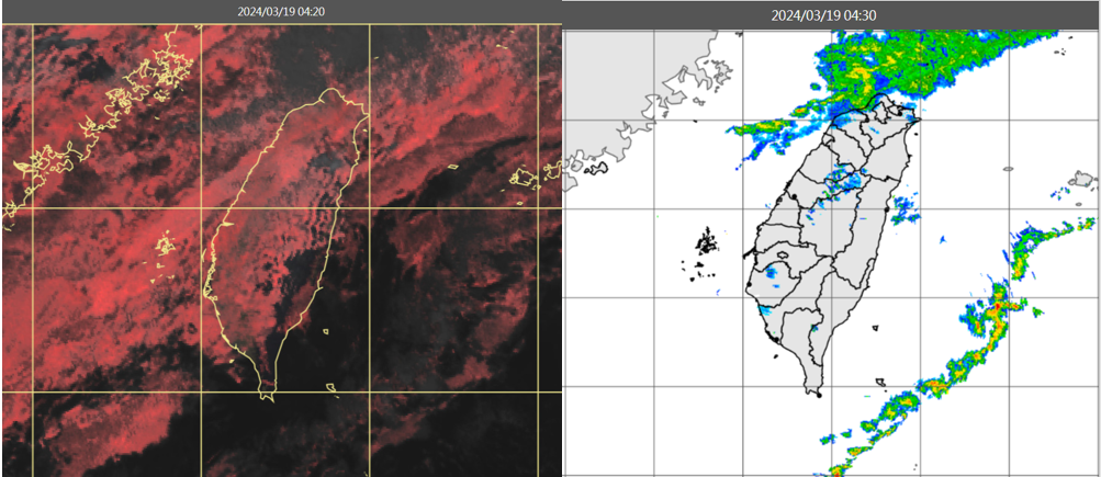 圖:今(19日)晨4:20真實色雲圖顯示,台灣上空雲層增多(左圖)。4:30雷達回波合成圖亦顯示,陸地上有降水回波消長(右圖)。 |