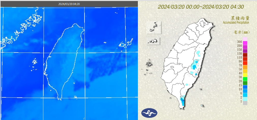 圖:今(20日)晨4:20紅外線色調強化雲圖顯示,花東有殘存的低雲,正逐漸消散中(左圖)。4:30累積雨量圖顯示,殘存低雲伴隨零星降雨(右圖)。 |