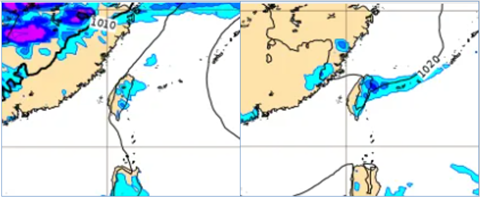 圖:最新(22日20時)歐洲(ECMWF)模式,23日20時地面氣壓及降水模擬圖(左圖)顯示,高壓迴流、東半部偶有局部短暫雨。26日20時模擬圖(右圖)則顯示,微弱鋒面下午抵達,北部、東半部轉有局部短暫雨。 |
