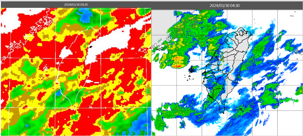 圖:今(30日)晨4:20紅外線色調強化雲圖顯示,台灣上空的雲層,大多為結構鬆散的中高雲(左圖);4:30雷達回波合成圖顯示,台灣上空的雲層伴隨弱降水回波(右圖)。 |