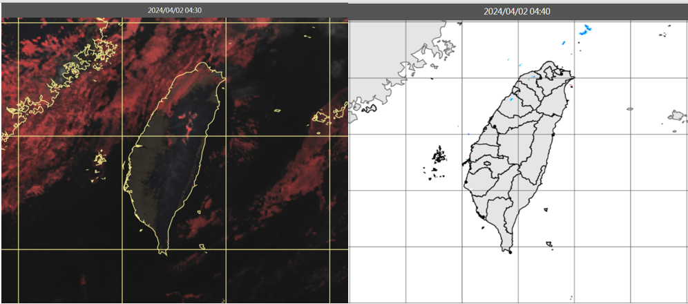 今(2日)晨觀測資料顯示,台灣海峽有低雲或霧(左圖)、無降水回波(右圖),馬祖已有濃霧發生。截至5:13各地區平地最低氣溫約在17至20度〔北部(新北貢寮、基隆七堵區)19.3度,中部(南投中寮鄉)20.3度,南部(屏東滿州鄉)19.6度,東部(花蓮壽豐鄉)16.7度〕。(再降請自行更新)